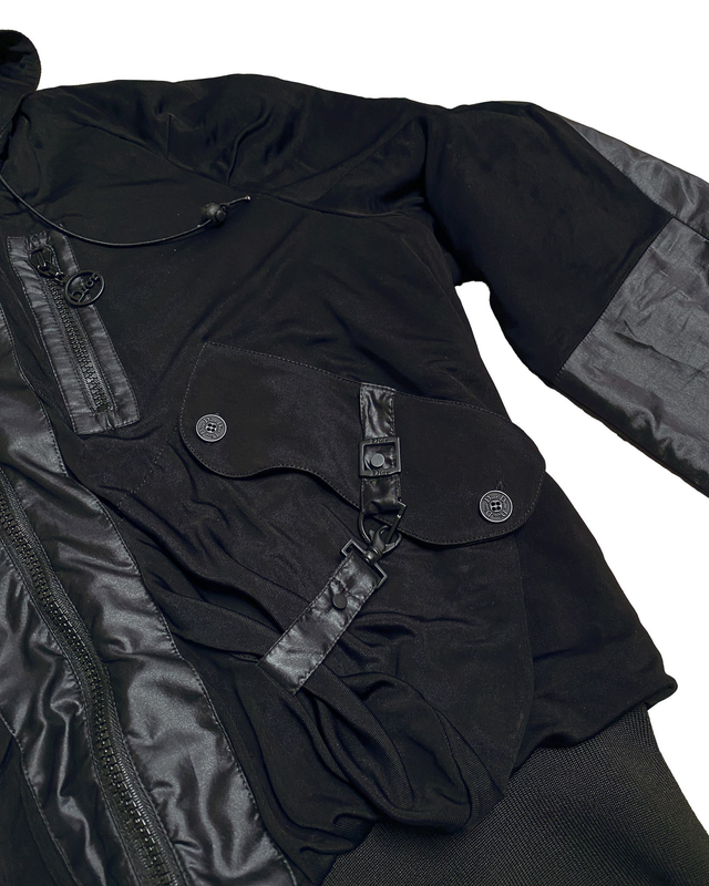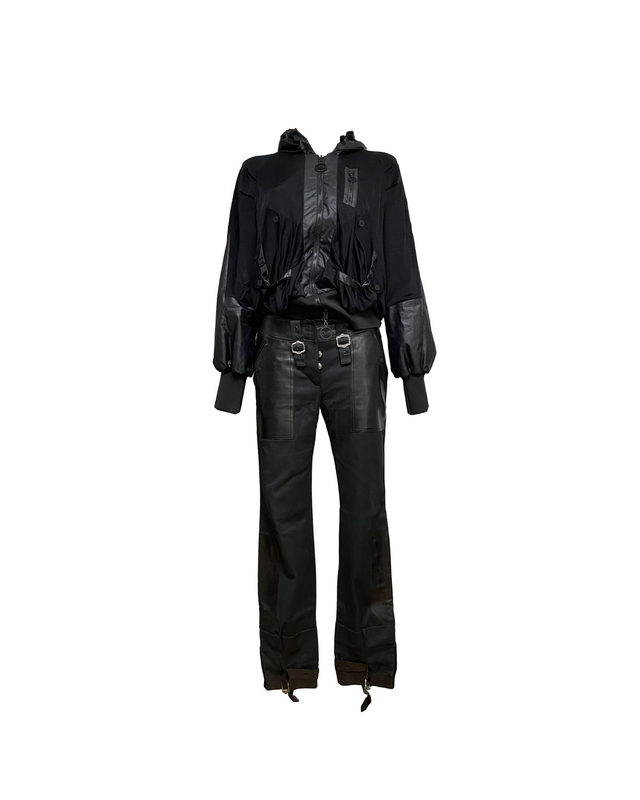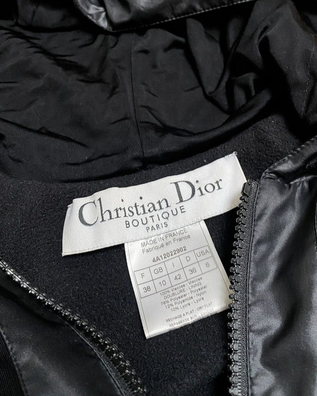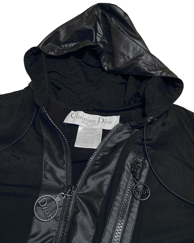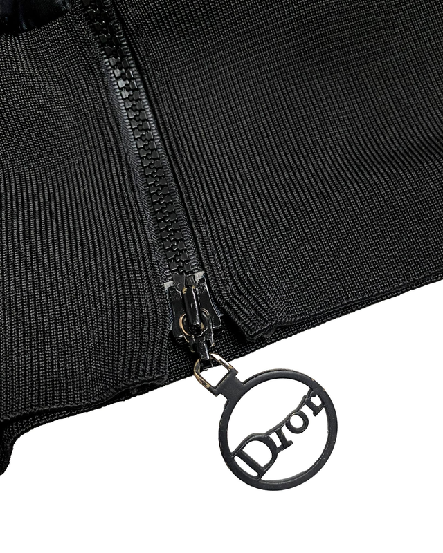 Issu de la collection Automne-Hiver 2004, ce blouson Dior par John Galliano revisite le bomber classique à travers le prisme de la ligne “Saddle”. Confectionné en viscose noire au fini légèrement satiné, il se distingue par ses deux poches latérales reprenant la forme iconique du sac Saddle. Le zip double curseur orné de l’anneau Dior apporte une touche utilitaire et sensuelle, typique de l’esthétique Galliano pour la maison. Les manches présentent un contraste de texture en nylon brillant, accentuant la construction sculptée du vêtement. Doublure molletonnée pour plus de volume et de confort. Une pièce hybride, à la fois urbaine et couture, signature de l’audace Dior du début des années 2000.