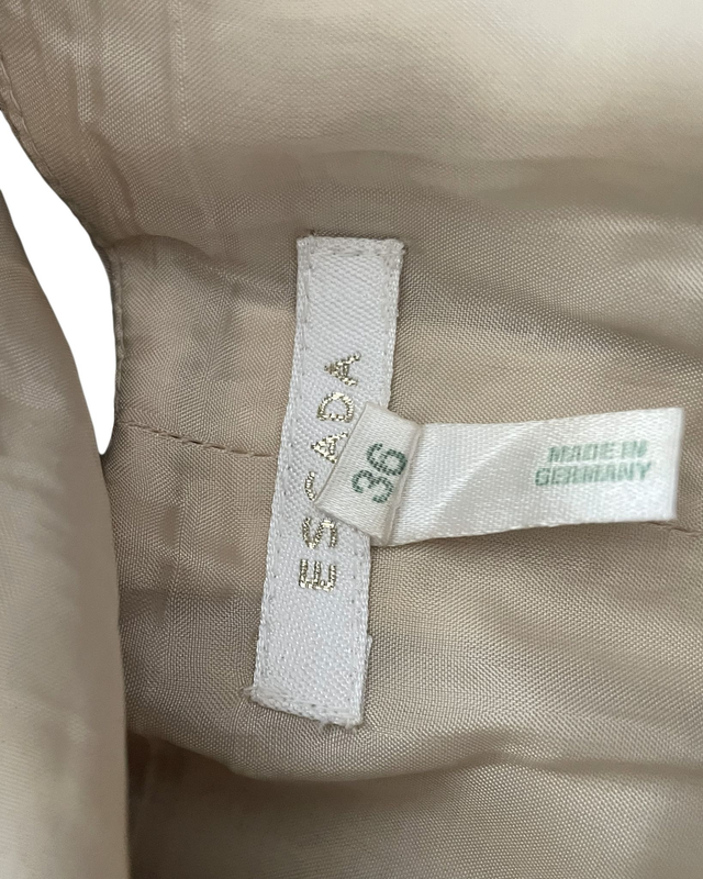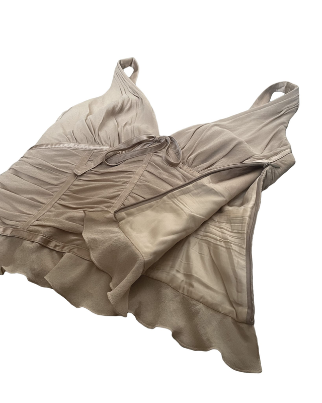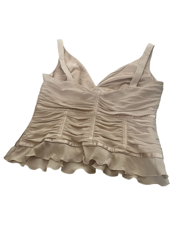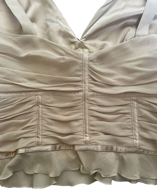 Bustier Escada à l’élégance romantique, en soie nude finement drapée. Sa construction corsetée souligne la taille tout en gardant une grande légèreté. Décolleté profond, laçage satiné à l’avant et base volantée pour un effet vaporeux et féminin. Une pièce délicate aux finitions soignées, idéale en superposition ou portée seule pour un look 2000s.