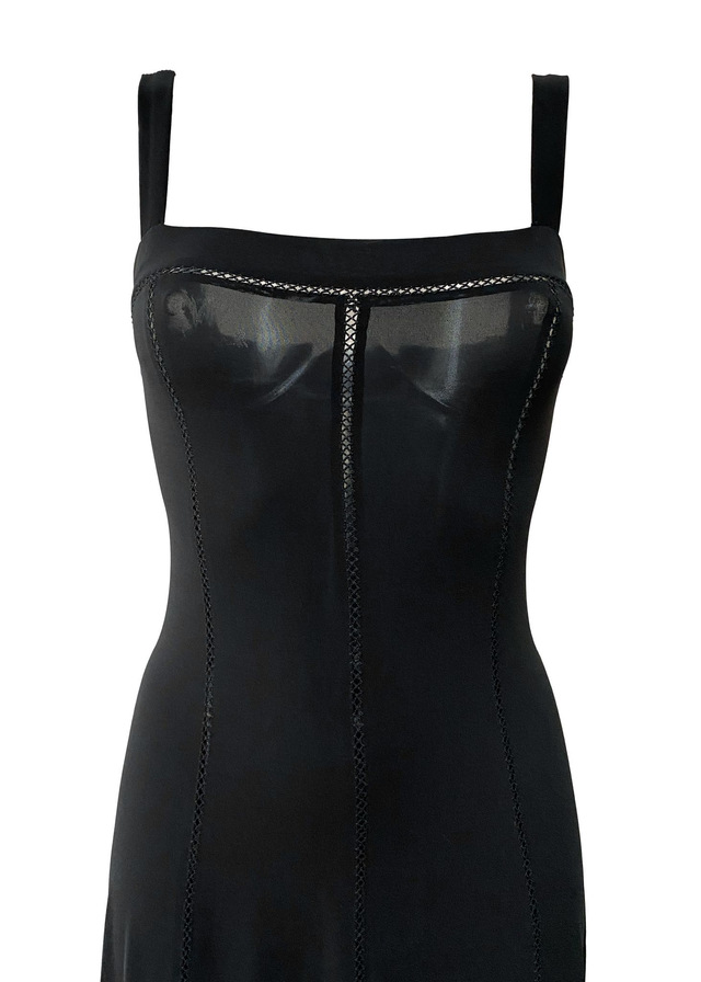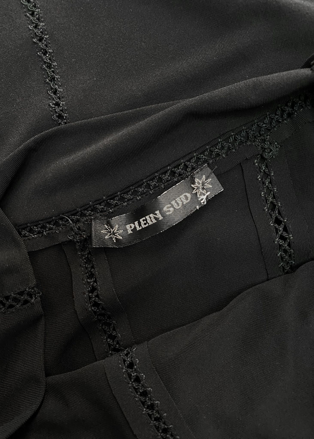 L'essence même du style Plein Sud par Fayçal Amor : une robe longue noire qui joue sur les codes de la sensualité et du minimalisme des années 90/2000. Cette pièce se distingue par ses finitions "jours échelle" (broderies ajourées) qui soulignent les coutures verticales pour allonger la silhouette. Le buste est mis en valeur par un empiècement en mesh transparent délicat, créant un contraste texturé avec le reste du corps en maille stretch sculptante. Une robe "femme fatale", à la fois rock et sophistiquée, typique de l'esthétique parisienne de l’époque.