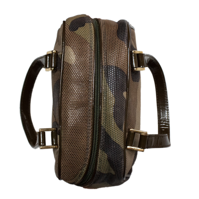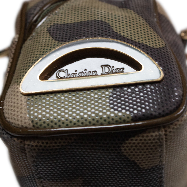 Sous l'impulsion provocatrice de John Galliano, la maison Dior a transformé les codes militaire en objets de désir absolu. Ce mini sac bowling, emblématique de l'esthétique "Street Chic" du début des millénaires, arbore un motif camouflage audacieux sur une toile texturée façon lézard, offrant un relief unique au toucher. Une pièce de collection rare, véritable capsule temporelle de l'âge d'or de Galliano chez Dior.