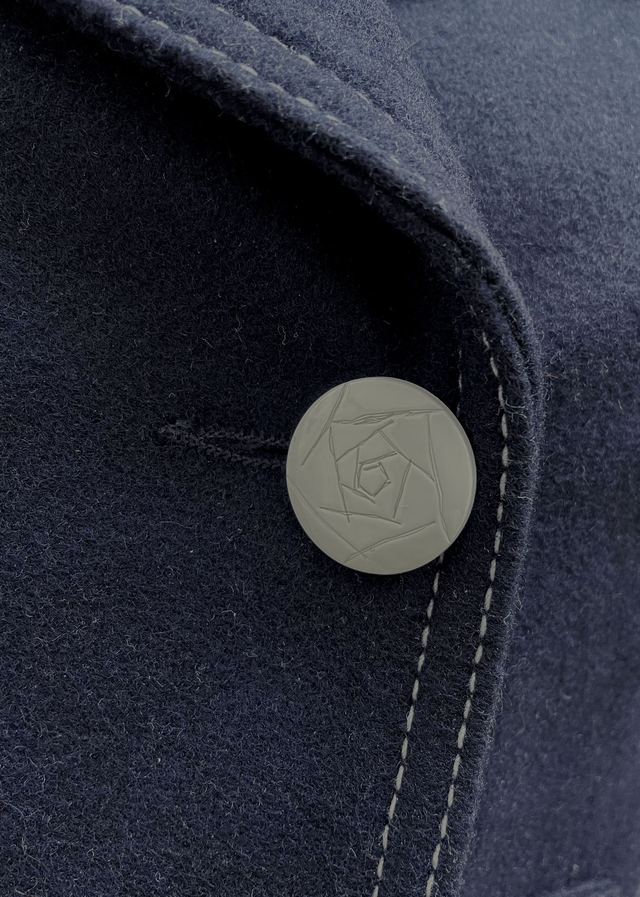 • Remarques : Coupe caban court, boutons siglés argentés, étiquette logo en métal au bas.